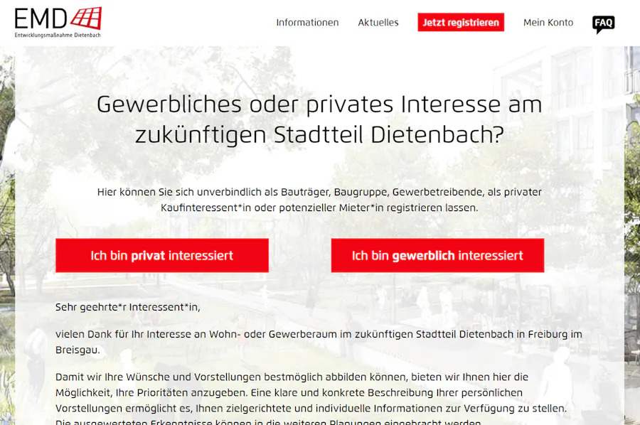 Es gibt wohl kaum ein größeres Projekt als einen neuen Stadtteil. Denn Vorhaben wie dieses betreffen Tausende von Bürgerinnen und Bürgern sowie viele Unternehmen der Region. Deswegen ist es unglaublich wichtig, alle Interessenten rund um das Projekt immer auf dem Laufenden zu halten! Welche Option wäre hierfür wohl besser geeignet als eine brandneue digalo Website? Auf der EMD-Website finden sich alle Informationen rund um das Thema Entwicklungsmaßnahme-Dietenbach, ihre Partner und aktuelle Informationen zum neuen Stadtteil.