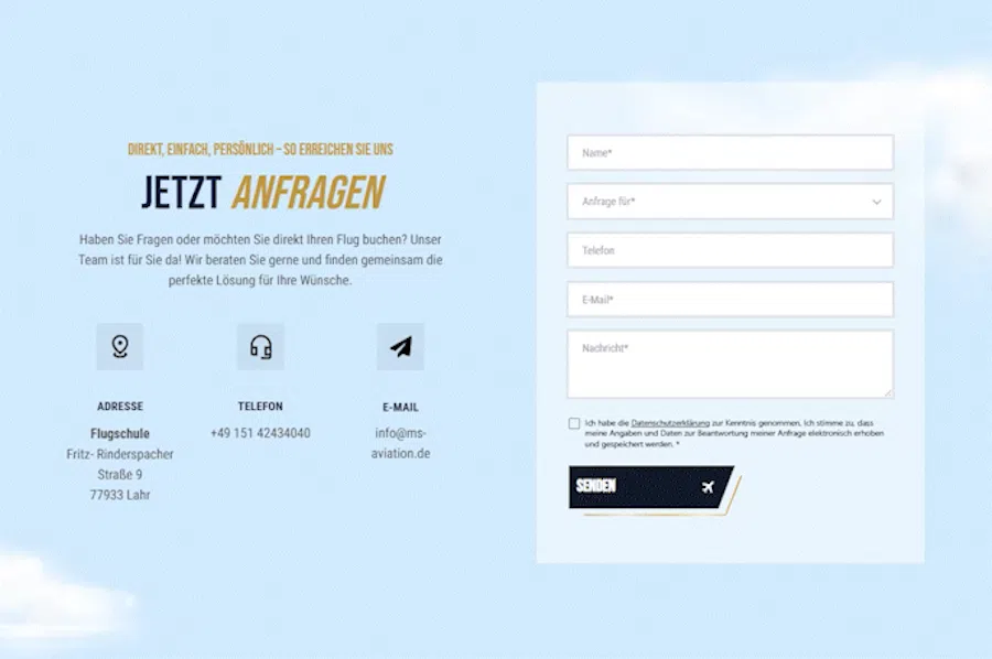 Einfach anfragen, direkt Antwort – dank des neuen Kontaktformulars wird aus Interesse schnell ein Flugerlebnis.